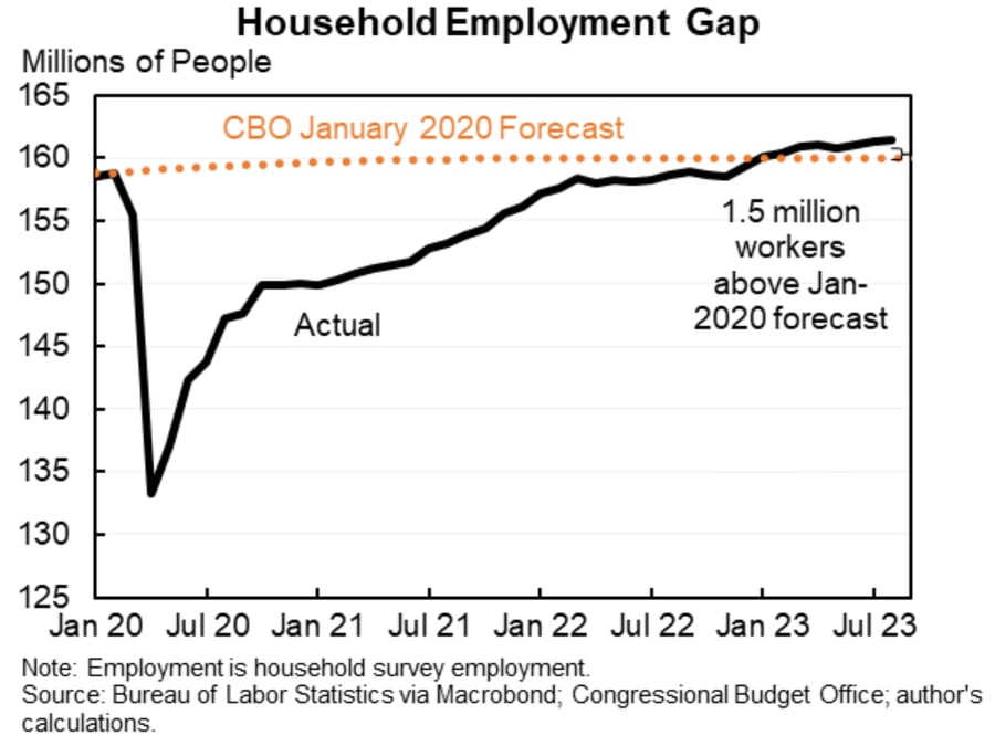 Overall both household and payroll employment are 1.5mm higher than CBO's pre-pandemic projections. It doesn't feel that long ago that people were talking about missing workers (talking about it for longer than was justified by the data I might add). Pretty much the only thing that went in the direction of tighter was average weekly hours ticked up but this series is noisy because of rounding and measurement issues. As a result, aggregate hours grew strongly as well. Average hourly earnings growth was the slowest in over a year and a half. This is noisy, subject to revision, but even adjusting for that perhaps the biggest sign of cooling in this report.